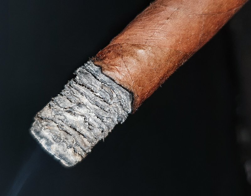 La ceniza, gris oscura y mucho rodal, aguanta relativamente bien, pero mejor no forzarla mucho porque acabará sobre tu camisa. El humo también cumple, siendo ligeramente azulado y muy aromático, abundante aunque algo ligero.