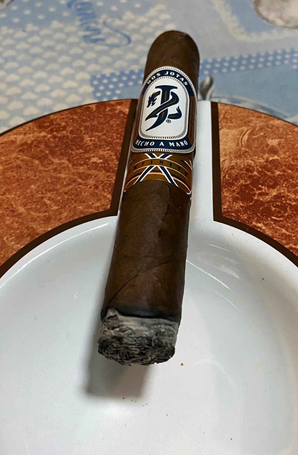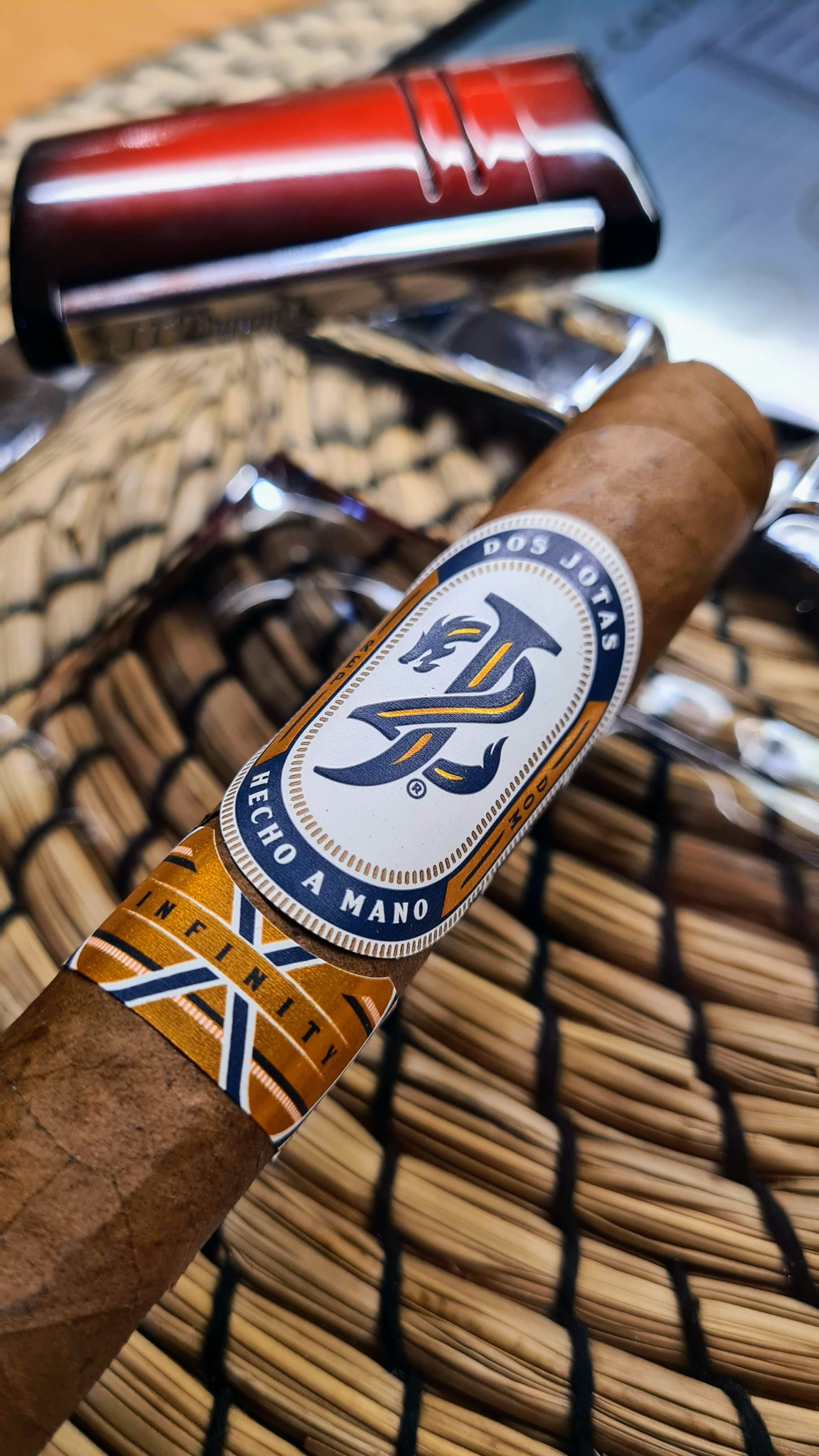 ¿Y cómo es este DOS JOTAS Infinity Robusto? Se trata de un cigarro con tabacos añejados 4 años en paca y hasta 2 años de reposo en la sala de casamiento. Con una presentación top, es de esos cigarros que llaman la atención, para bien, desde el primer momento. La anilla es preciosa, moderna pero atemporal, en mate (azul y blanco) y algún brillo (cobre), que hace que la gente mire qué estás fumando. Viste una capa colorado con ligero brillo, venas poco marcadas y un tacto exquisito.