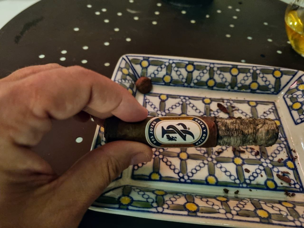 En el último tercio sube nuevamente el cuerpo, la punta dulce desaparece por completo, manteniéndose la base herbácea, el café (en semilla), las almendras y las puntas mineral y tostada, apareciendo notas de cuero. Un tercio que nos indica que no es un tabaco para tomar con el estómago vacío.